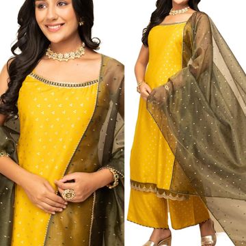 FIORRA Women's Yellow Silk Blend Straight Kurta with Palazzo and Dupatta
