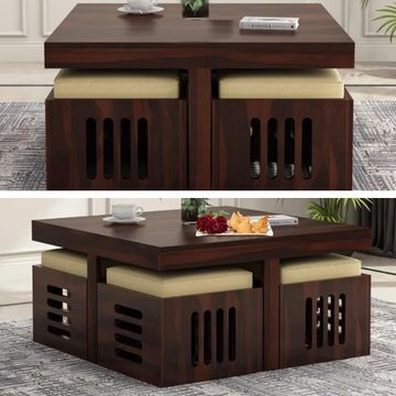 Safenap Wooden Coffee Table with 4 Stools | Sheesham Wood Coffee Table for Living Room | Center Teapoy Table (Walnut Finish)