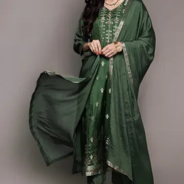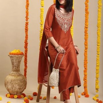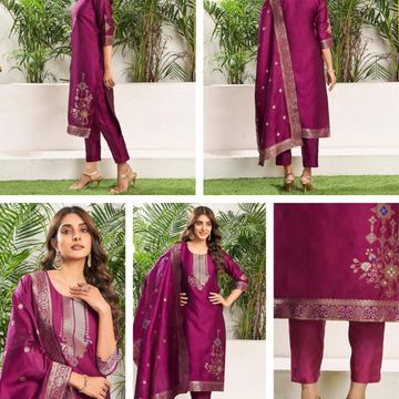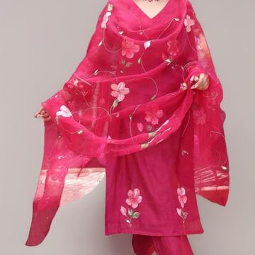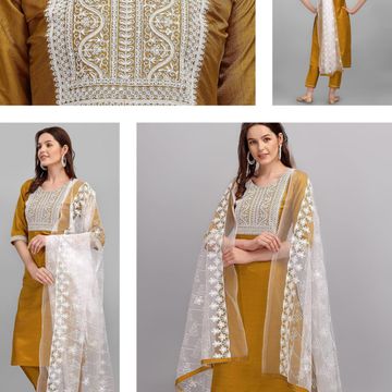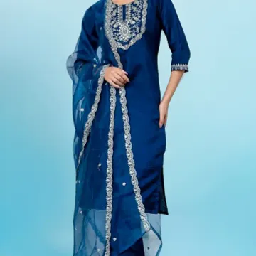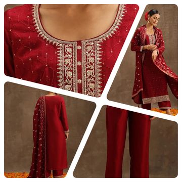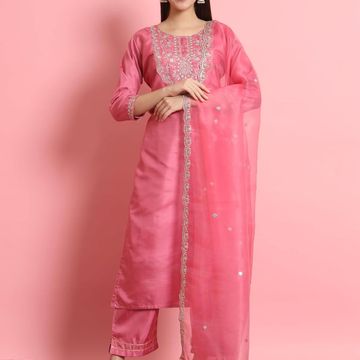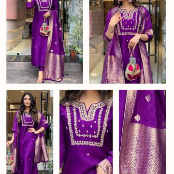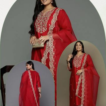 VredeVogel Women's Silk Blend Embroidered Kurta with Pant & Dupatta Set