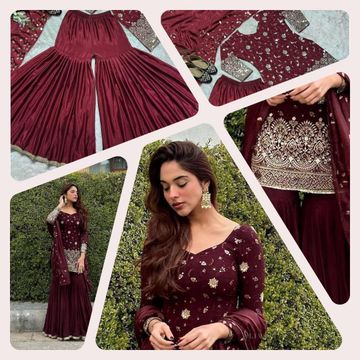 Miss Ethnik Dual Tone Strip Chinon Heavy Embroidered Stitched Sharara Suit Set With Dupatta (ME-1129)