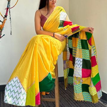 Atrangi Saree Yellow - Handwoven, 100% Cotton Patchwork Saree, Eco