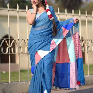Kota Cotton Maskali Saree, Blue with Appliqué Flowers, Piping