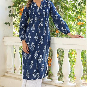 Janasya Women's Indigo Pure Cotton Floral Printed Pleated Kurta