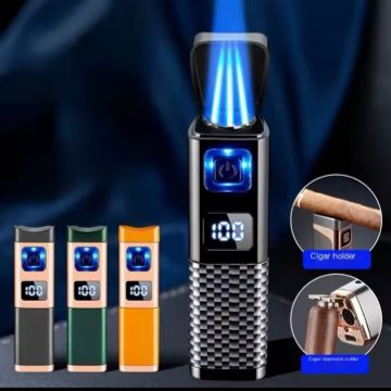2024 Multi functional Windproof Three Flame Cigar Lighter Visual Gas Window Digital Battery Display Gas Type-C Electric Lighters