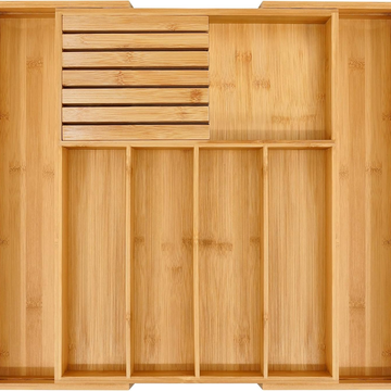 VaeFae Bamboo Silverware Drawer Organizer Kitchen, Expandable Utensil Organizer with Knife Block, Cutlery Tray with Divider, Multifunctional Wooden Drawer Organizer