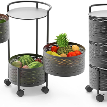JAQ Rotating Storage Shelves Rack for Kitchen, 3-Tier Multi Layer Removable Basket Shelf Organizer on Rolling Wheels for Fruit Vegetable Grocery Corns Potato Onion (3-Tier, Black)