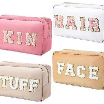 Remerry 4 Pcs Nylon Cosmetic Bag Chenille Letter Cosmetic Pouch Zipper Preppy Waterproof Hair Bag with Patches Makeup Organizer Bag Set for Women (Earth Tone, Stuff, Face)