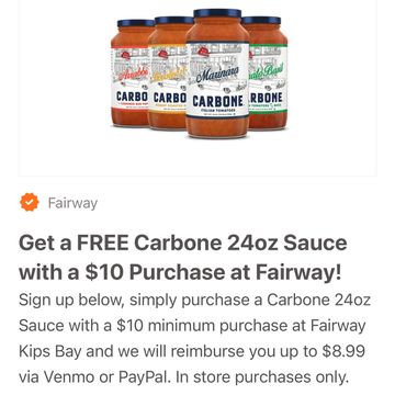 Carbone 24oz Sauce with a $10 Purchase at Fairway