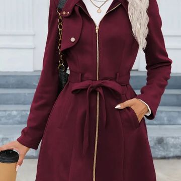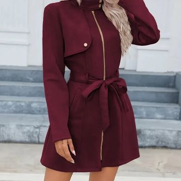 Zip-up Stand Collar Mid-length Belted Coat