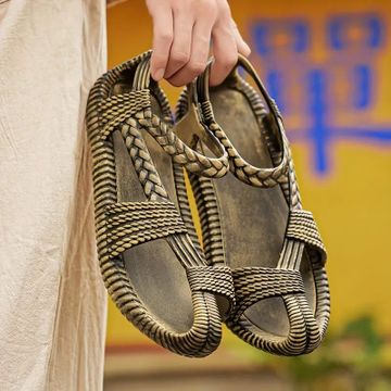 Men's Outdoor Flat Sandals With Retro Woven Straw Shoes