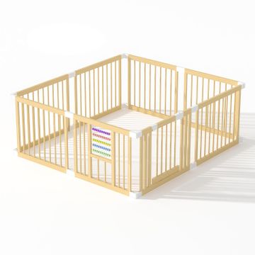 Baby Playpen with Gate, Wooden Playpen for Babies and Toddlers, Baby Play Yard with Colorful Acrylic Beads, Baby Fence Play Area with Suction Cups, Extra Large Play Pen Area Indoor(71 * 63 *