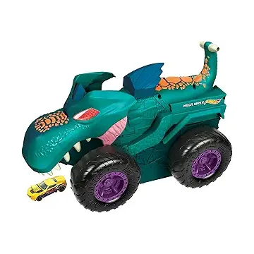 Hot Wheels Monster Trucks Car Chompin' Mega-Wrex, Large Toy Monster Truck & Toy Car, Eats & Poops 1:64 Scale Vehicles, Lights & Sounds
