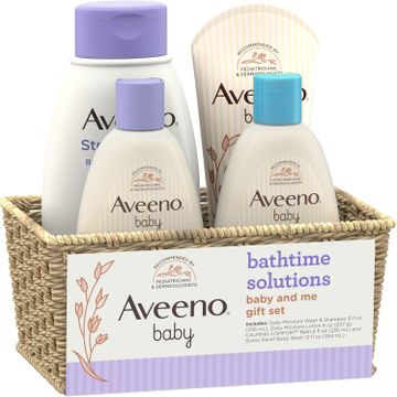 Aveeno Baby Bathtime Solutions Baby & Me Gift Set with Baby Wash & Shampoo, Calming Baby Bath, Baby Daily Moisturizing Lotion & Stress Relief Body Wash for Mom, Oatmeal, 4 Items
