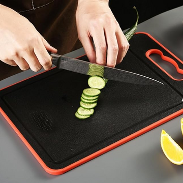 Cutting Board with Defrosting Tray Knife Sharpener, and Spice Grater. 4-in-1 (MSY3) Multi-use, No Electricity; Press Board Double-Sided Frost Away Plate Chopping Board Kitchen. (Black & Red)