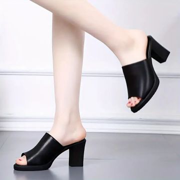 Women'S Elegant Open Toe Slides, Black High Heel Mules, Non-Slip Rubber Sole