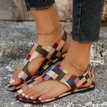 Women's Plaid Pattern Flat Sandals, Casual Loop Toe Summer Shoes