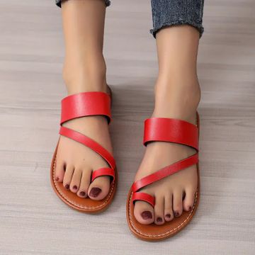 Women's Red Loop Toe Slide Sandals, Casual Slip On Flat Beach Shoes