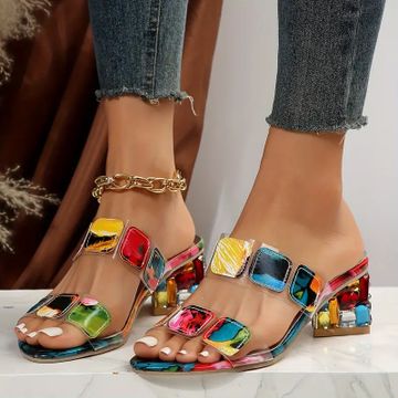 Women's Colorful PVC Sandals, Rhinestone Chunky Heel Slip