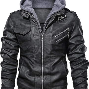 HOOD CREW Men’s Casual Stand Collar PU Faux Leather Zip-Up Motorcycle Bomber Jacket With a Removable Hood