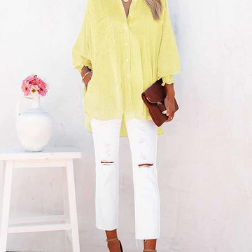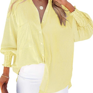 Women's Smocked Cuffed Striped Boyfriend Shirt with Pocket