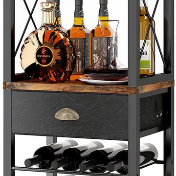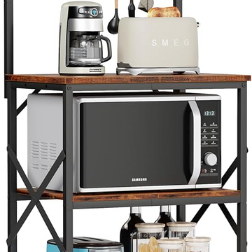 Furologee 4-tier kitchen baker's rack with microwave stand, spice rack, pegboard, and 6 hooks. Rustic brown finish.