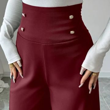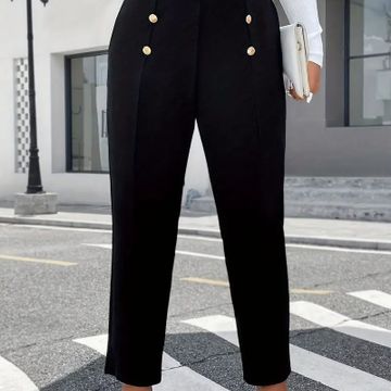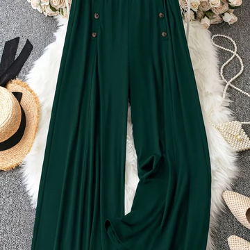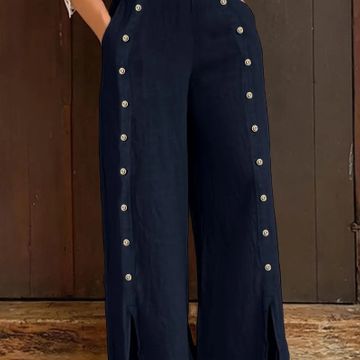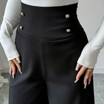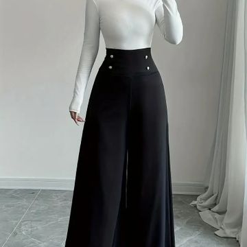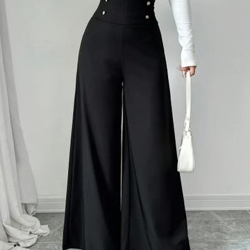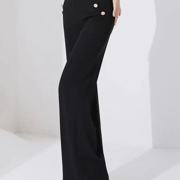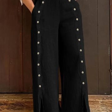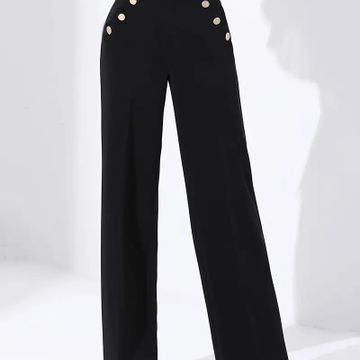 Women's Elegant Black Wide-Leg Pants with Decorative Buttons