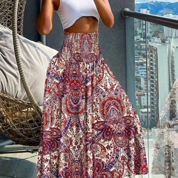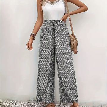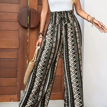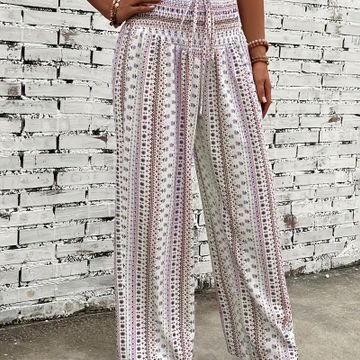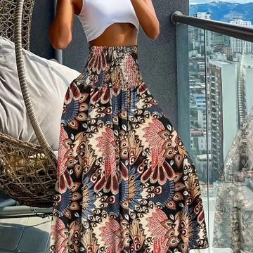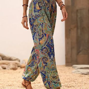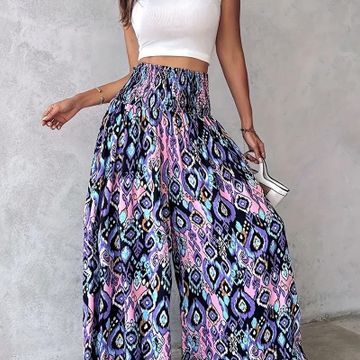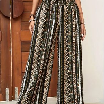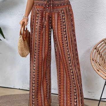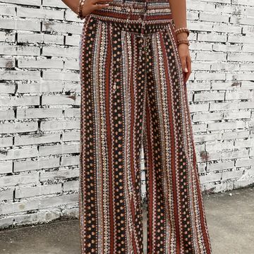 Bohemian Style Wide Leg Pants for Women, Ethnic Print Shirred Waist