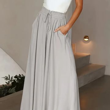 Solid Color Loose Elastic Waist Wide Leg Pants, Slant Pocket Spring