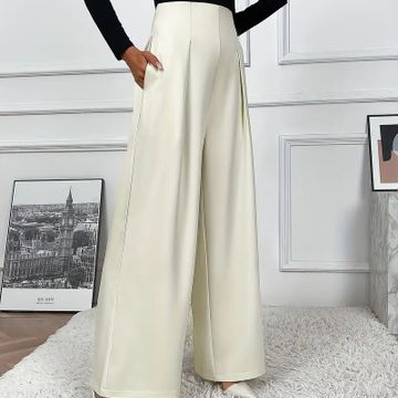 1pc Women'S High-Waisted Wide Leg Pants, Solid Color Polyester