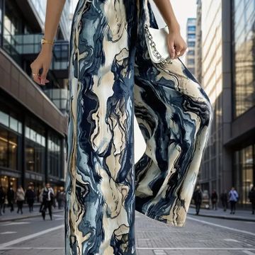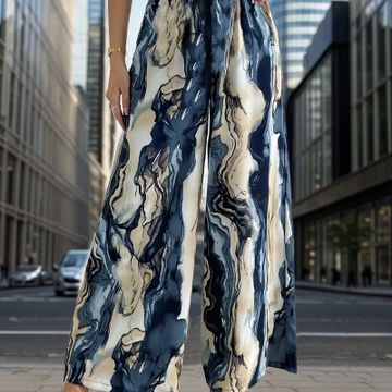 Marble Print High Waist Pants, Casual Wide Leg Pants For Sprin