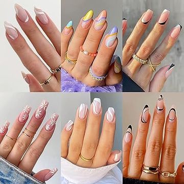 6 Packs (144 Pcs) Press on Nails Medium Design, Misssix Fake Nails Almond and Square Glue on Nails Set with Adhesive Tabs Nail File for Women