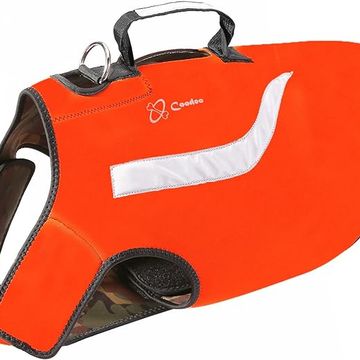 Coodeo Dog Hunting Vest Orange, Camo and Reversible Reflective Dog Tactical Harness Hound Jacket for Protection and Security, 4.5mm Neoprene Waterproof Safety Dog Vest Both Sides to Wear (Large)