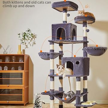 Taoqimiao 76-Inch Cat Tree Cat Tower for Indoor Cats, Plush Multi-Level Cat Condo with 12 Scratching Posts, 2 Perches, 2 Caves, Hammock, 2 Pompoms MS016G Smoky Gray