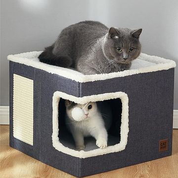 CATBOAT Cat Bed for Indoor Cats Cube House, Covered Cat Cave Beds & Furniture with Scratch Pad and Hideaway Tent, Cute Modern Cat Condo for Multi Small Pet Large Kitten Kitty, Grey