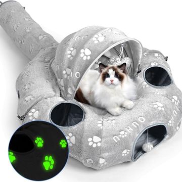 OUHOU Cat Tunnel Bed with Plush Cover, Cat Tunnels for Indoor Cats, Cat Donut Tunnel with 4 Fluffy Toy Balls, Self-Luminous Cat Tube, Peekaboo Cat Cave for Kittens, Rabbits and Large Pets