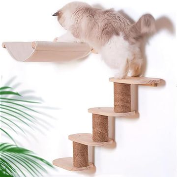 Cat Wall Climbing Steps Hammock Set - Cat Wall Mounted Shelves and Perches for Indoor Cats, Cat Floating Furniture Wood for Cat Jumping, Scratching, Playing and Lounging (4 Steps + Hammock)