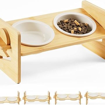 HICC PULE Elevated Pet Bowls for Cats & Small Dogs, Natural Bamboo with Ceramic Raised Small Dog Bowls, Cat Food Dish Bowls Elevated and 15° Tilted, Whisker Friendly, Dishwasher Safe