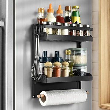 aceyoon Etagere Magnetique Frigo, Multifonction Etagere Epice Magnétique Puissant, Rangement Cuisine Gain de Place avec Porte Sopalin et 4 Petit Crochets pour Réfrigérateur, Machines à Laver (Noir)