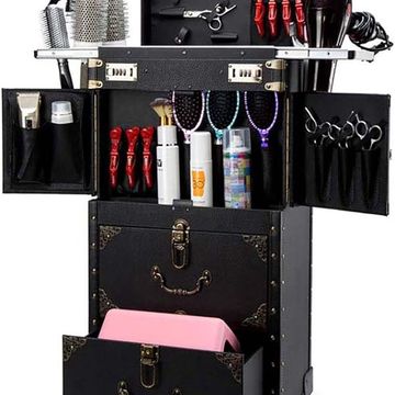 اسكيس حقيبة مكياج دوارة قابلة للقفل لمصفف الشعر وصالونات التجميل وحقيبة السفر منظم ادوات السفر مع حامل مجفف الشعر, اسود