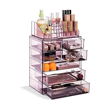 سوربوس منظم مكياج شفاف لمستحضرات التجميل - تخزين المكياج والمجوهرات والحقيبة والعرض - تصميم واسع - حامل رائع للخزانة والحمام وطاولة الزينة (3 ادراج كبيرة و4 ادراج صغيرة) [ارجواني]