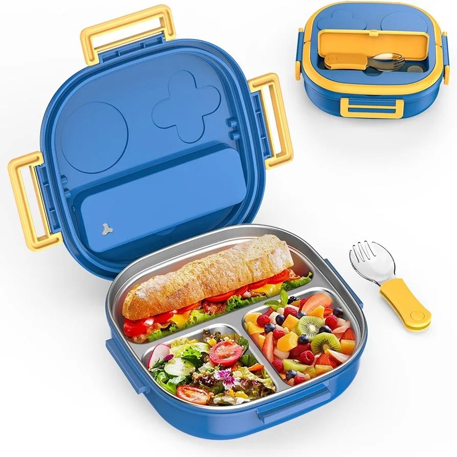 Stainless Steel Bento Box for Kids - 3-Compartment Design - Complete Lunch Set with Portable Cutlery - Ideal for Children Aged 10 & Under - Dishwasher Safe & BPA-Free(Blue)