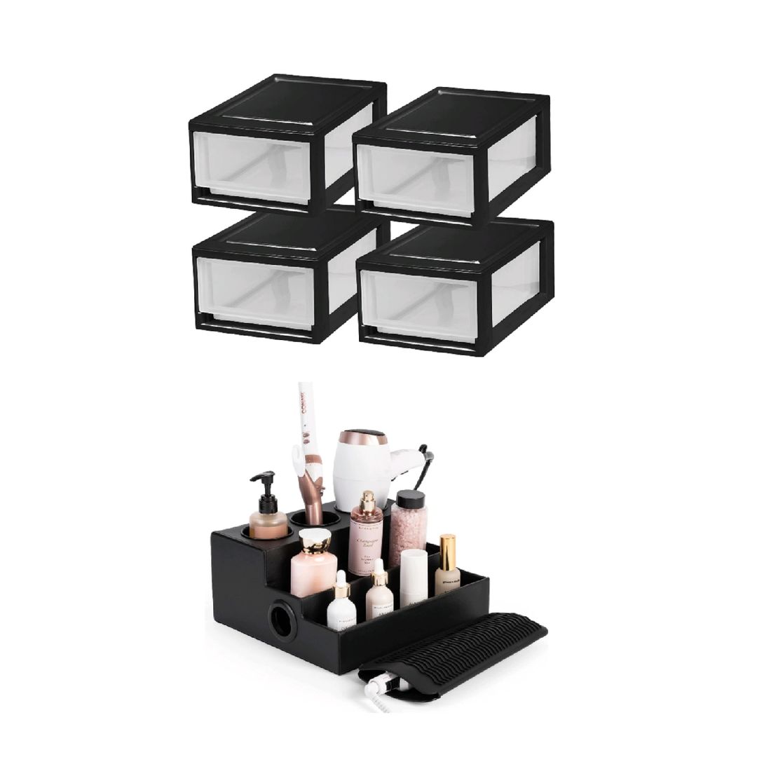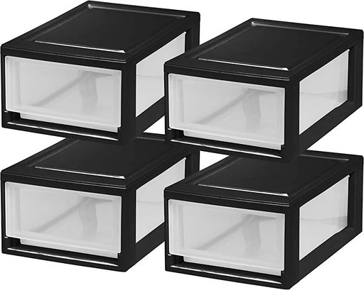 IRIS USA 6 Quart Compact Stacking Storage Drawer, Plastic Drawer Organizer with Clear Doors for Undersink, Kitchen, Pantry, Desk, and Home De-Clutter, Store Shoes and Craft Supplies, 4-Pack, Black