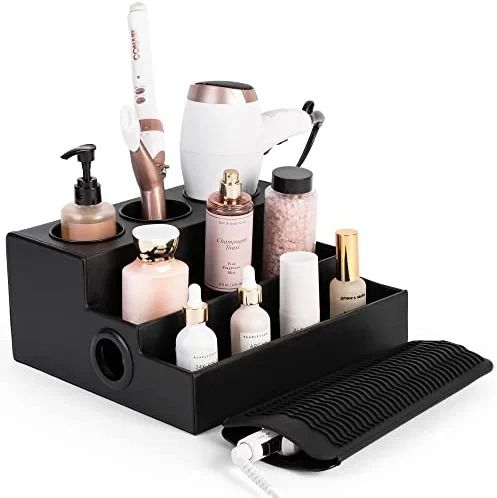 Hair Tool Organizer, Blow Dryer Holder, Flat Iron Storage, 12”x10.5”, Black, 3 Tier, Hot Tools Station, Styling Product Caddy, Organizers for Bathroom, Countertop, Vanity w/ Silicone Mat | Houseables