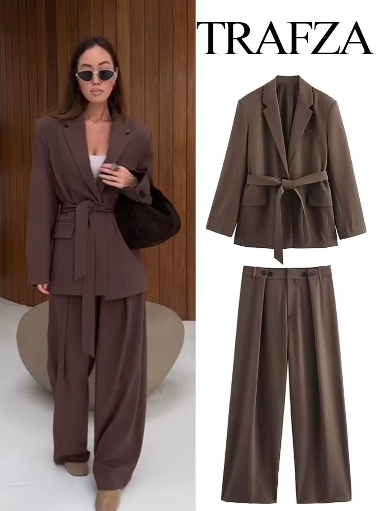 TRAFZA Women Chic Solid Lapel Pocket Belt Decorate Casual Blazer Coat+Fashion High Waist Loose Button Zipper Long Pants Suit - AliExpress 200000345