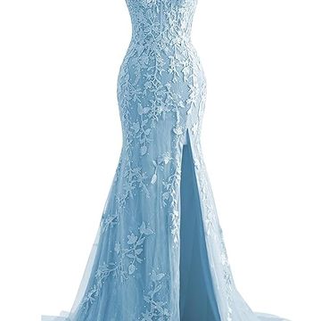 Fokissy Mermaid Prom Dresses with Slit Lace Applique Tulle Sweetheart Formal Evening Gown