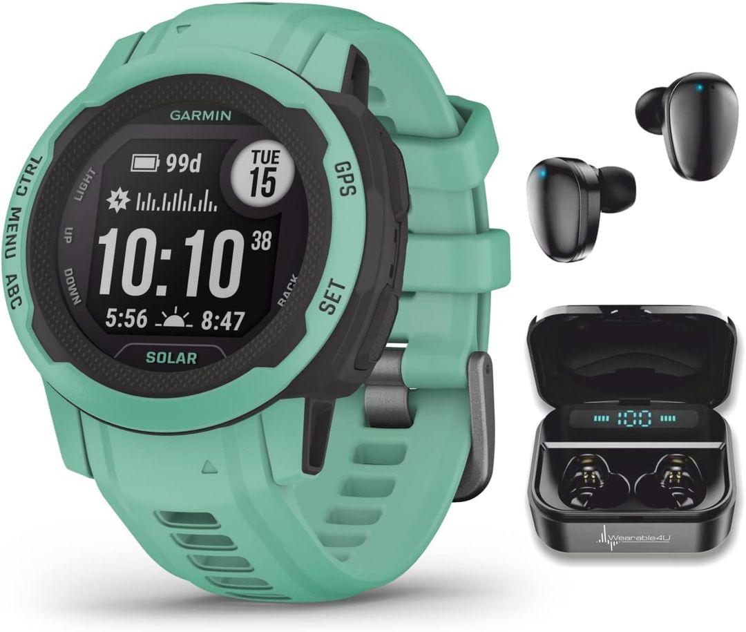 Wearable4U Garmin Instinct 2S Solar 40 mm GPS Rugged Outdoor Smartwatch Neo Tropic with Multi-GNSS Support Black Earbuds Bundle