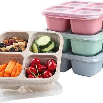PUiKUS 4 Pack Snack Containers, 4 Compartments Bento Snack Box, Reusable Meal Prep Lunch Containers for Kids Adults, Divided Food Storage Containers for School Work Travel