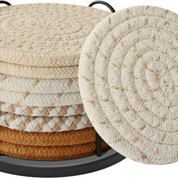 Coasters Set of 8 for Drinks, Beer, Coffee, Cotton Woven 4 Colors Absorbent Coaster with Holder, Boho Coasters for Home Decor Tabletop Protection Suitable for Kinds of Cups, Coffee