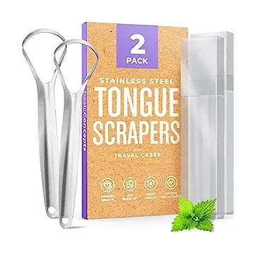BASIC CONCEPTS Tongue Scraper for Adults (2 Pack), Reduce Bad Breath (Travel Cases Included), Stainless Steel Tongue Cleaners, 100% Metal Tongue Scraper with Case Fresh Breath Tongue Cleaner Oral