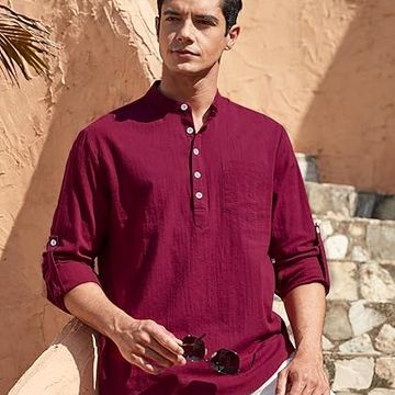 Uomo Camicia in Lino di Cotone Manica Lunga Henley Shirt con Bottoni Casual Hawaii in Tinta Unita Maglietta T-Shirt da Uomo per Interni Spiaggia Hippie